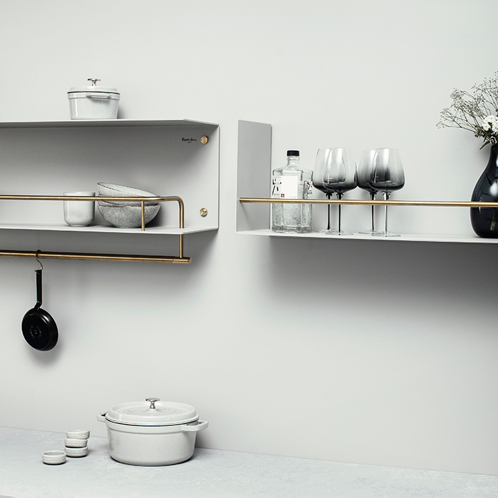 The heavy-duty shelf is made from laser cut 4mm sheet aluminium, press bent and powder coated. To keep your belongings where they should be, it features a 12mm hand polished solid metal guard rail, polished by hand and matching solid metal coin screws.