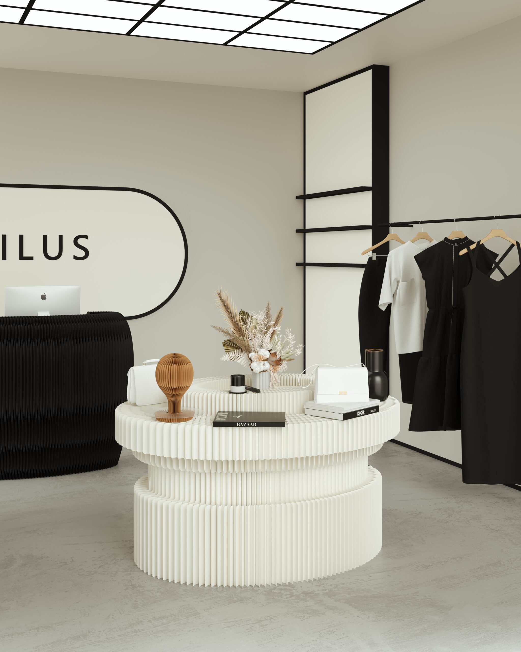 Its circular, tiered form draws inspiration from classical forums—places where people gathered, explored, and exchanged. The sculptural, pleated surface creates rhythm and depth, while the stepped profile allows products to be displayed at multiple heights, naturally guiding the eye around the piece.
