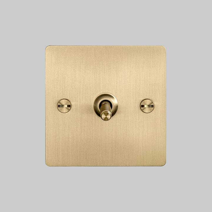 A 1G 3-way intermediate toggle switch finished in brass plate. The toggle arm can be made from solid steel or brass and features our signature, diamond-cut, cross knurl pattern.