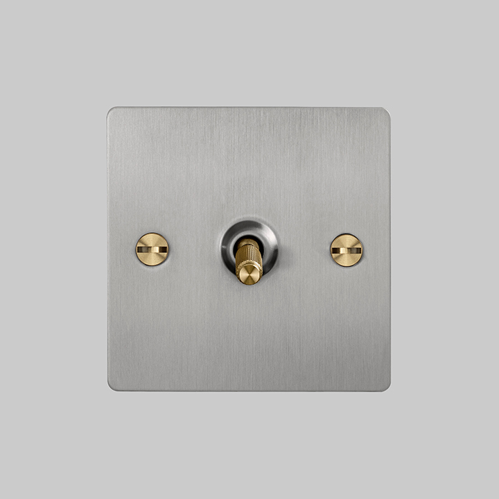 The toggle switch features a lightly brushed flat plate, fixed with our signature solid steel coin screws
