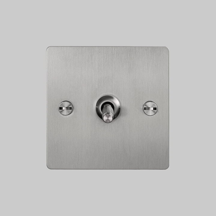 The toggle switch features a lightly brushed flat plate, fixed with our signature solid steel coin screws