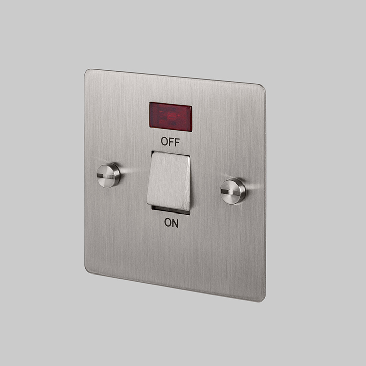 A 20A double pole switch with neon, finished in steel. The switch features our signature, solid steel, coin screws.