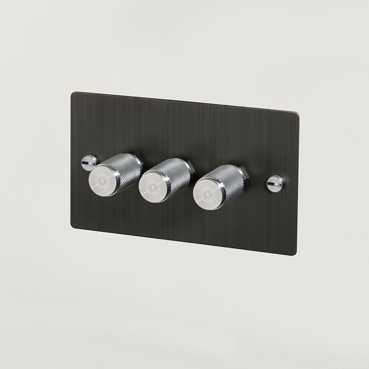 The dimmer switch features a flat plate made from lightly steel. The plate is fixed with our signature, solid brass, coin screws.