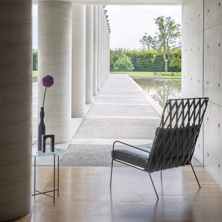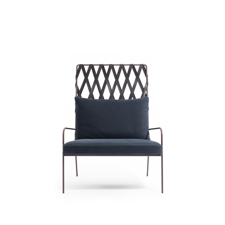 Modern and sophisticated, minimalist and stunning, the Alix armchair stands out for its woven backrest obtained by intertwining leather strips