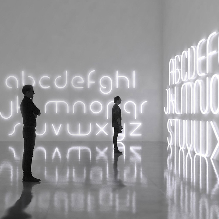 Alphabet of light is a language based on light intended to convey freedom, an elementary principle generating an open system. BIG starts from an abacus of essential geometries to design a new font that translates into light, an alphabet used to write and to express one’s thoughts, a tool to give shape to spaces. It allows to design light in space with words, as well as with graphic signs. Two linear elements of different lengths and two round ones are combined with a system of letters, numbers, and symbols.