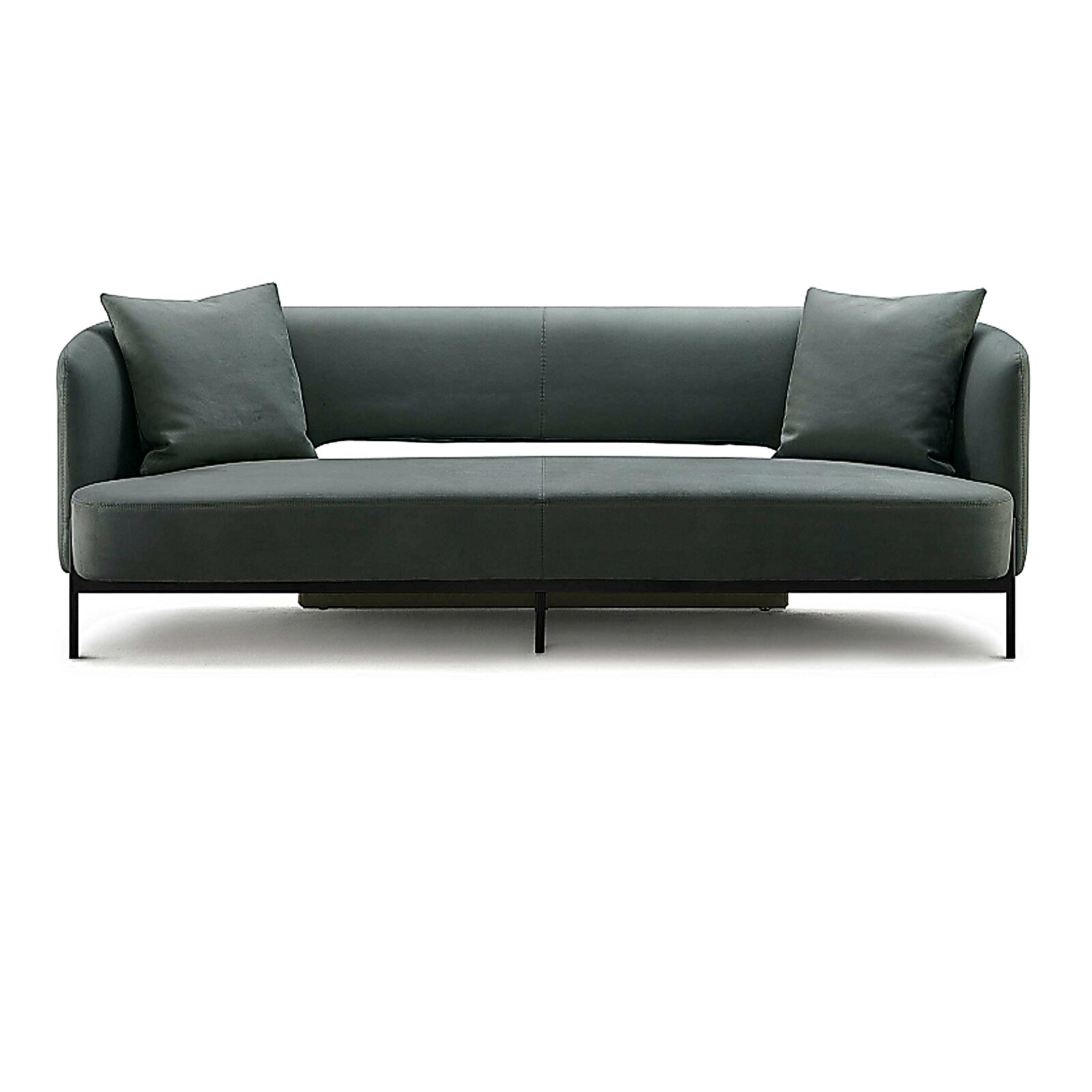 Its continuous backrest wraps gently around the seating, creating a subtle cocoon without visual heaviness. A distinctive detail is the negative gap between the back and seat, giving the sofa a “floating” character and adding architectural depth to an otherwise minimal silhouette.