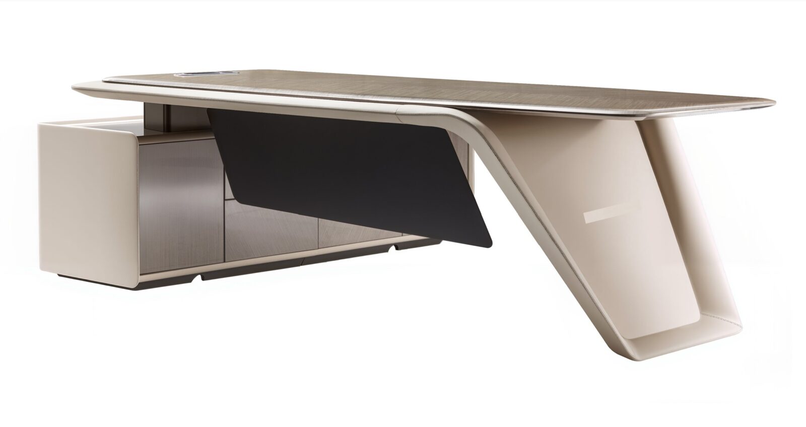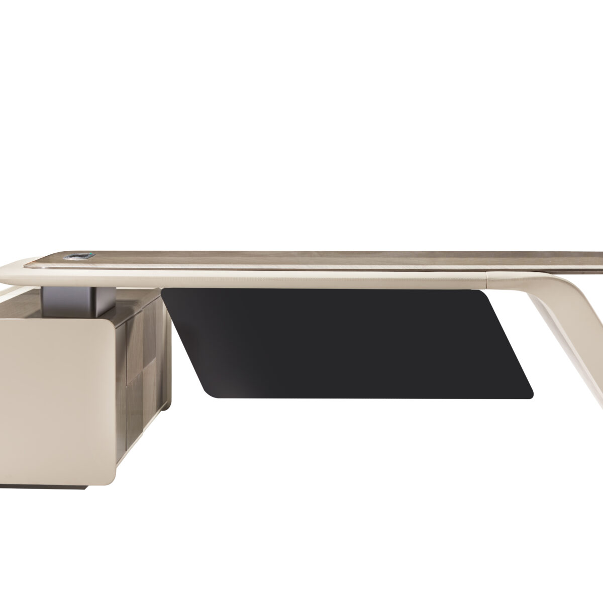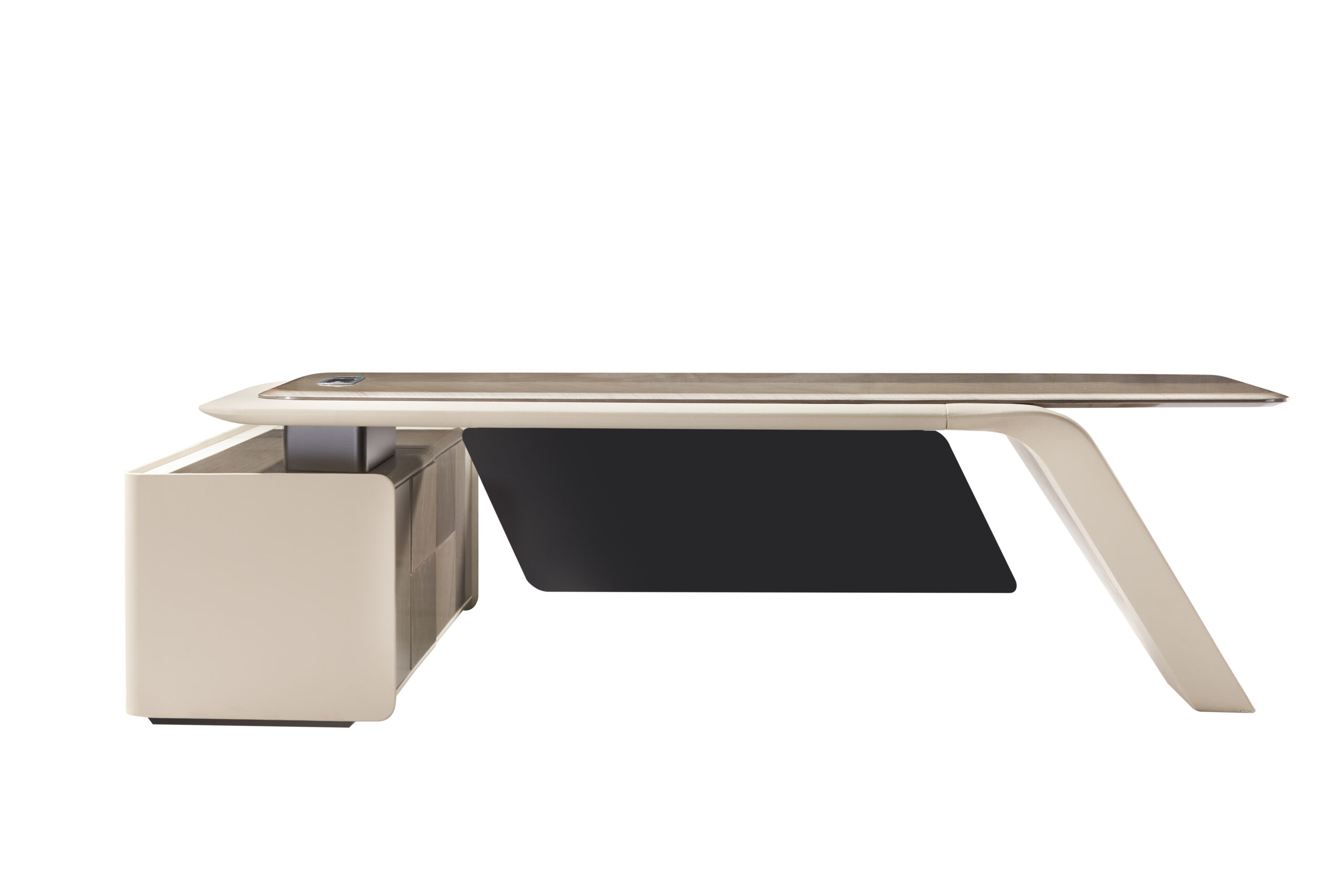 The deskās silhouette is defined by continuous curves and softened edges, evoking the language of contemporary Italian architecture. Upholstered bases wrap the structure like tailored leather couture, while the surfaceācrafted in fine wood veneer or natural stoneārests above with an almost suspended elegance. Subtle metal accents introduce a restrained sense of luxury, never decorative, always intentional.