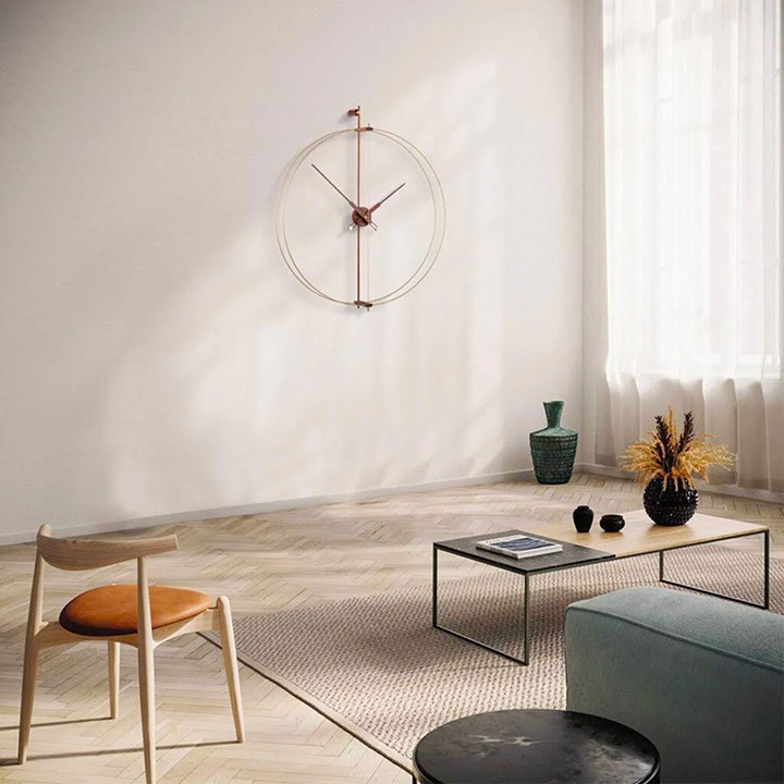 Barcelona is a Minimalist wall clock design by Nomon. that provide your space with a distinguished a character With a double, black fiberglass ring this clock combines walnut pieces with different metallic finishes that perfectly symbolize the essence of the brand. An icon design that has become a timeless classic