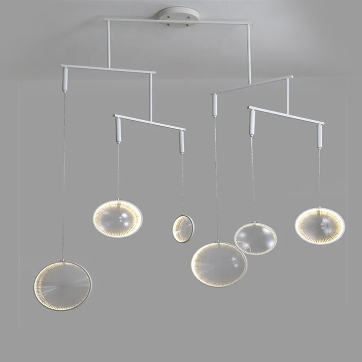 Brinley pendant lamp, designed in contemporary style. This pendant connecting three size round glass LED light. Three different size round glass arrange in different level. Brinley available in two options arrangement; it makes six and nine arrangement round glass.