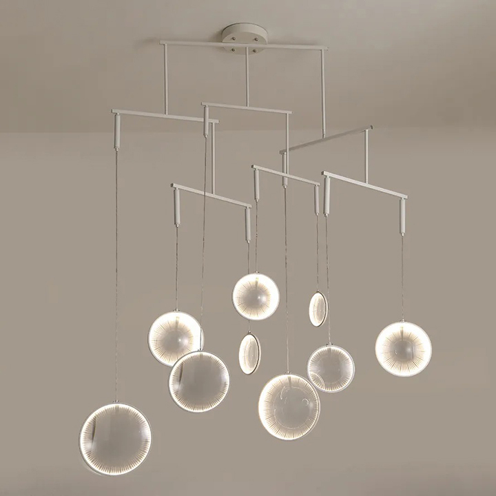 Brinley pendant lamp, designed in contemporary style. This pendant connecting three size round glass LED light. Three different size round glass arrange in different level. Brinley available in two options arrangement; it makes six and nine arrangement round glass.