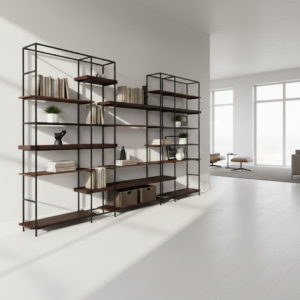 Banyak ruang hunian maupun ruang kerja saat ini menghadapi permasalahan klasik yang berulang, yaitu keterbatasan penyimpanan yang tidak seimbang dengan estetika. Rak atau lemari sering kali hanya berfokus pada fungsi, mengorbankan tampilan visual, atau sebaliknya, terlihat menarik namun tidak cukup kuat dan tahan lama.  Carson Storage Black Iron hadir sebagai jawaban menyeluruh atas kebutuhan akan penyimpanan yang kuat, estetis, dan bernilai jangka panjang. Dirancang dengan pendekatan desain industrial modern, produk ini memadukan struktur besi hitam dengan sentuhan kayu berlapis warna walnut gelap, menciptakan keseimbangan antara kesan maskulin dan kehangatan alami.