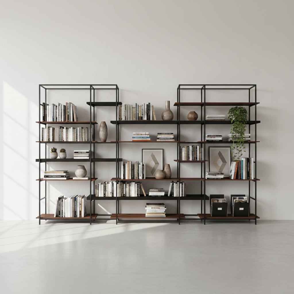 Banyak ruang hunian maupun ruang kerja saat ini menghadapi permasalahan klasik yang berulang, yaitu keterbatasan penyimpanan yang tidak seimbang dengan estetika. Rak atau lemari sering kali hanya berfokus pada fungsi, mengorbankan tampilan visual, atau sebaliknya, terlihat menarik namun tidak cukup kuat dan tahan lama.  Carson Storage Black Iron hadir sebagai jawaban menyeluruh atas kebutuhan akan penyimpanan yang kuat, estetis, dan bernilai jangka panjang. Dirancang dengan pendekatan desain industrial modern, produk ini memadukan struktur besi hitam dengan sentuhan kayu berlapis warna walnut gelap, menciptakan keseimbangan antara kesan maskulin dan kehangatan alami.