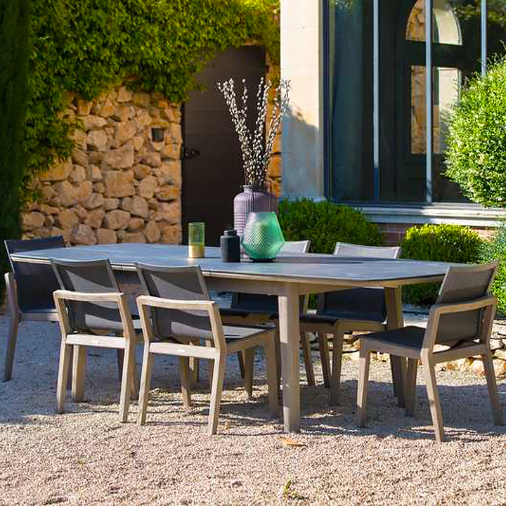 COPENHAGEN stackable dining armchair in teak with DuratekĀ® finish and Batyline Eden grafito canvas. Extremely comfortable, these armchairs will allow you to spend quality time around a table.