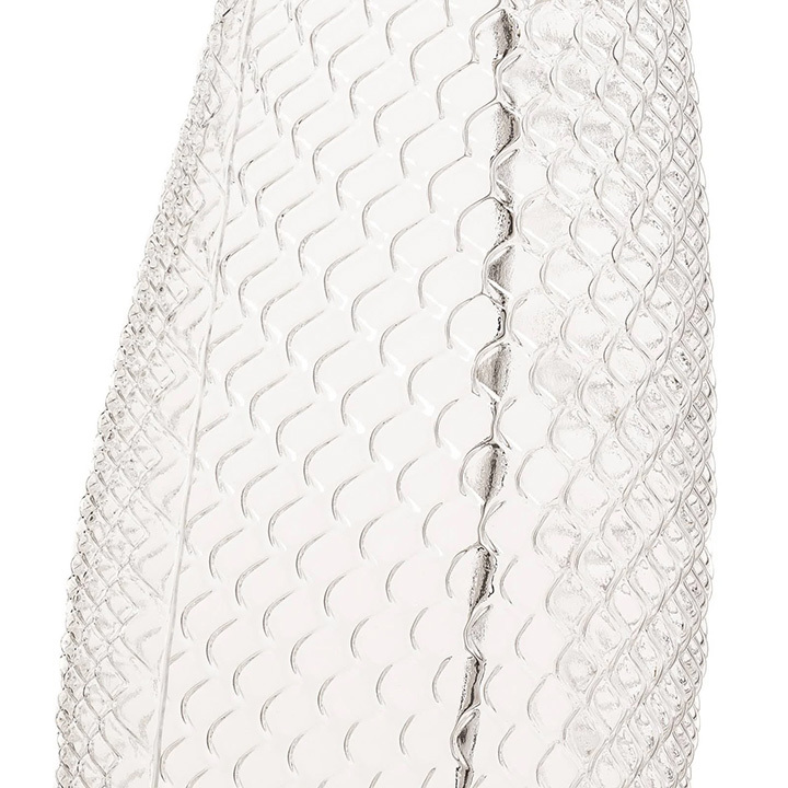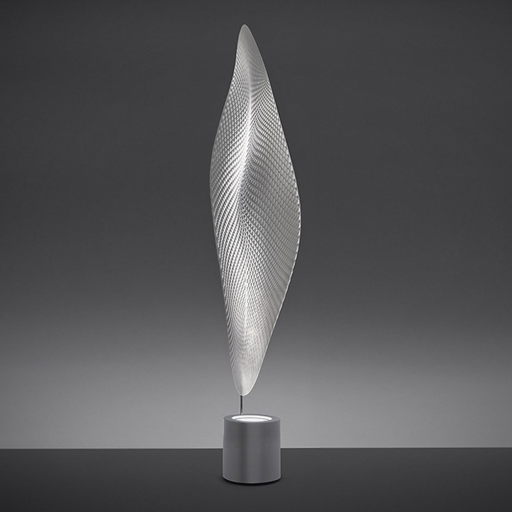 “It appears as a digital leaf from another World , embedded with scales like a reptile or an insect which gather light and shadow on its body to seduce a mate.” Available with halogen or metal halide source. Materials: chromed steel structure; body lamp-diffuser in transparent methacrylate with texture; painted metal lighting unit