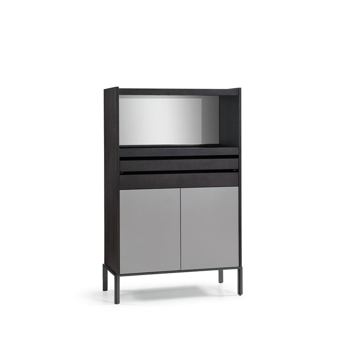 - Permukaan depan dilengkapi panel kaca hitam yang memberikan kesan modern, reflektif, dan eksklusif, sekaligus menyamarkan isi lemari agar tampak selalu rapi