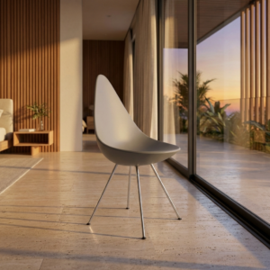 Fleksibilitas desain Drop Chair Grey Fabric memungkinkan kursi ini ditempatkan di berbagai ruang dan konsep interior.