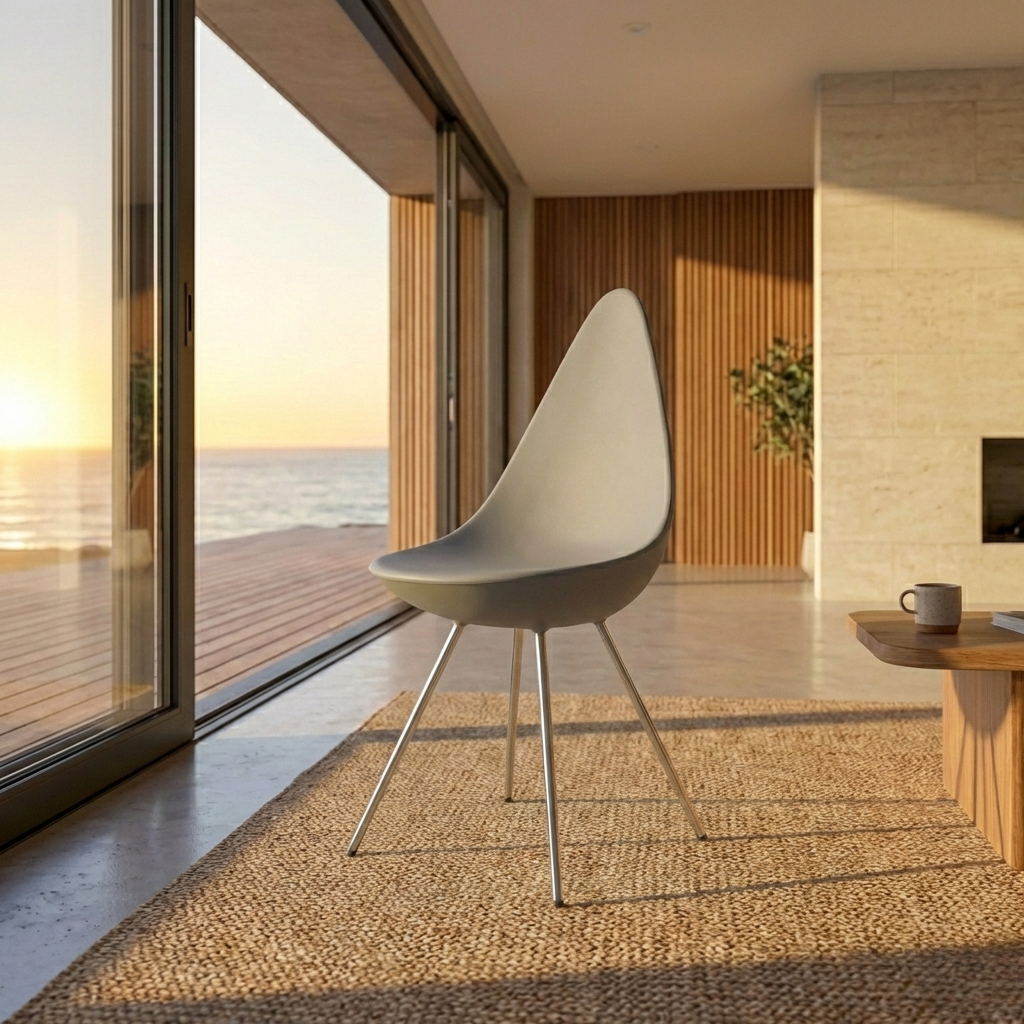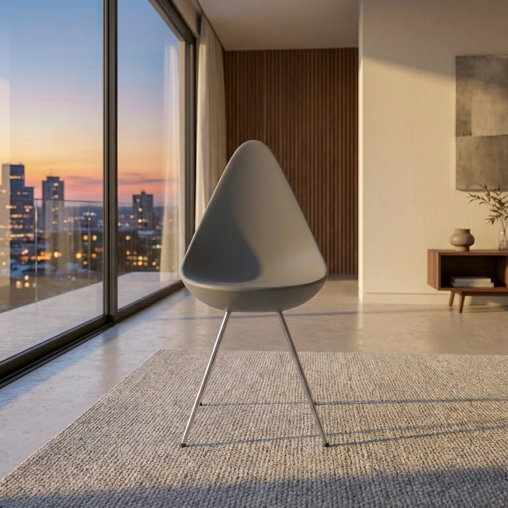 Fleksibilitas desain Drop Chair Grey Fabric memungkinkan kursi ini ditempatkan di berbagai ruang dan konsep interior.