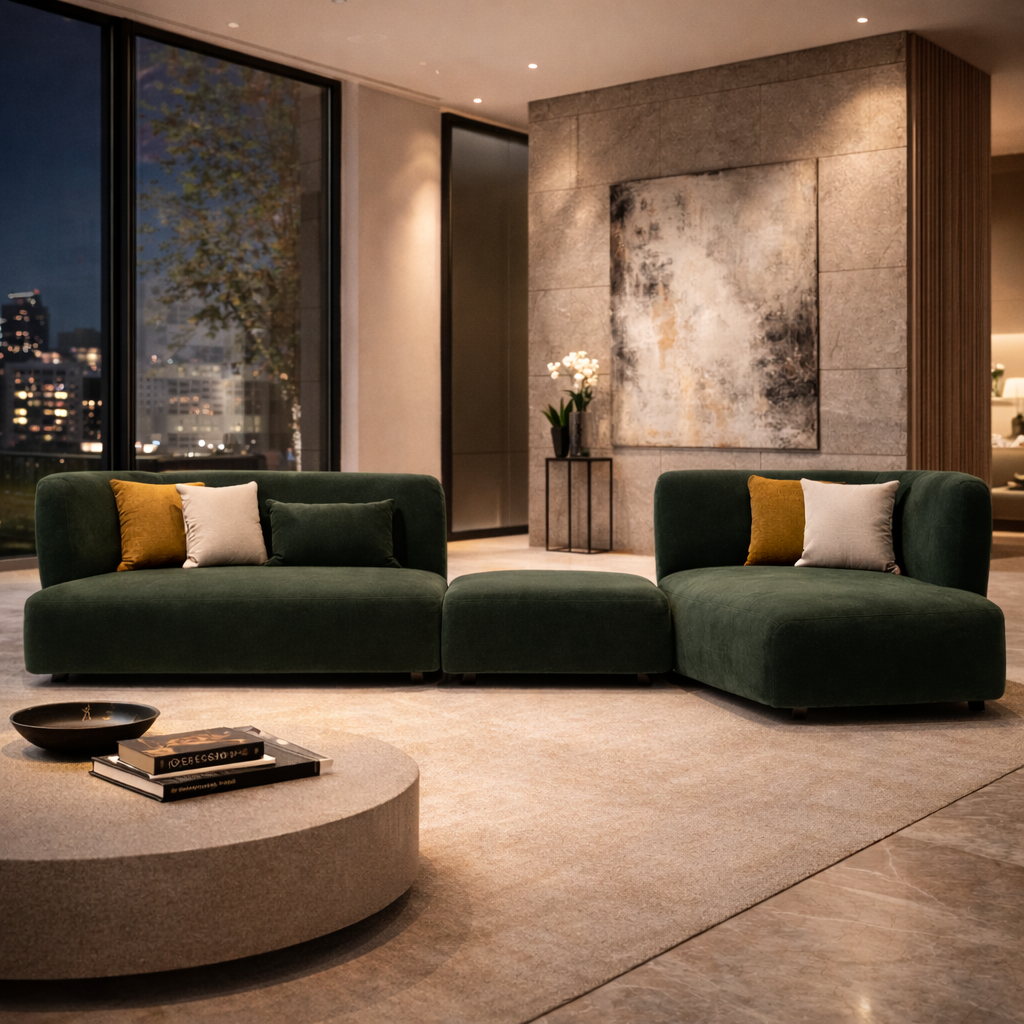 Upholstered in rich, tactile fabrics, ELARA brings warmth to modern interiors, luxury residences, and curated hospitality settings. It is a sofa that blends seamlessly into its surroundings, offering a quiet sense of elegance and emotional comfort.