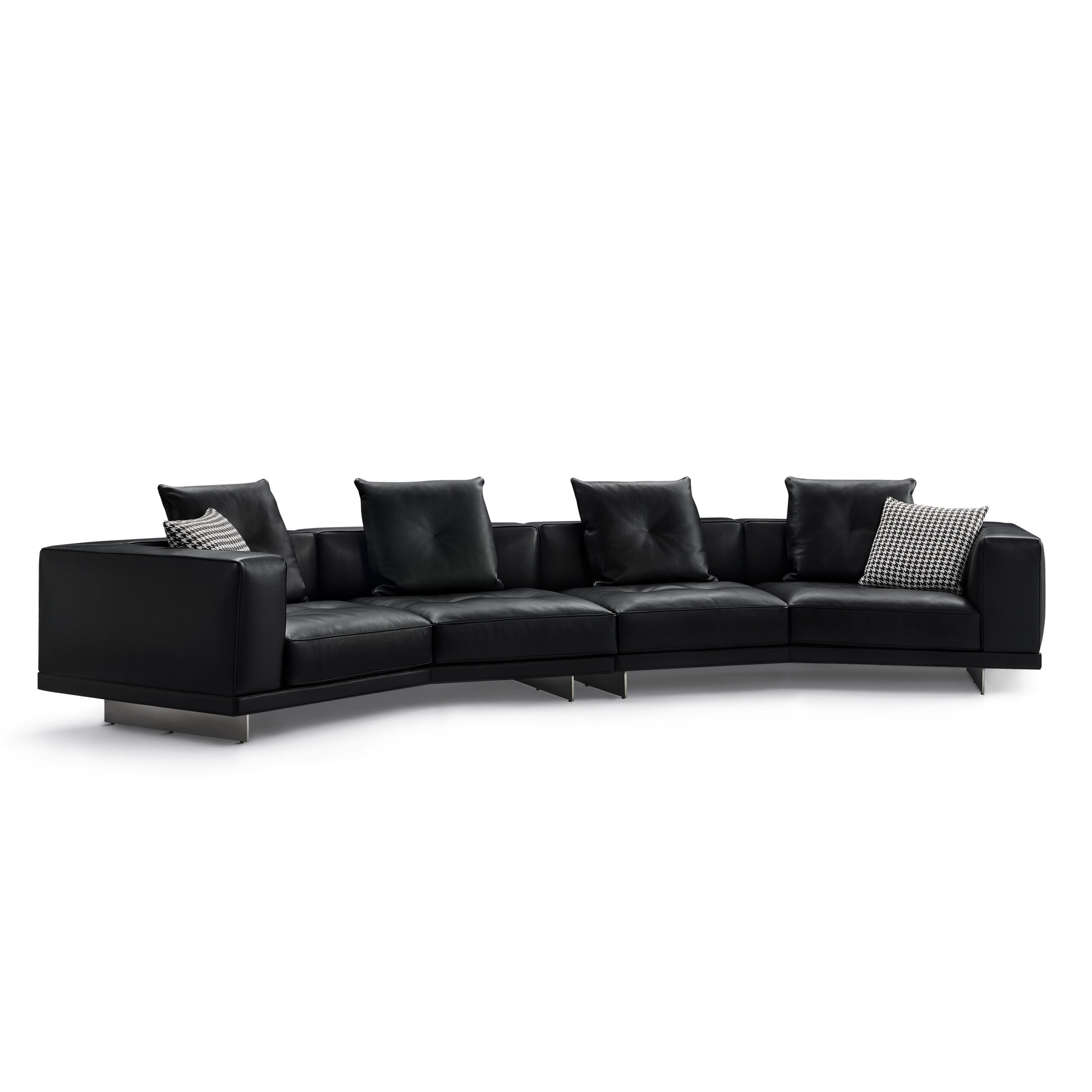 Its broad arms and crisp volumes create a clear architectural presence, while deep seat cushions and oversized back pillows soften the experience for everyday lounging. The silhouette reads disciplined and premium, supported by slim metal legs that lift the mass and keep the profile visually light.