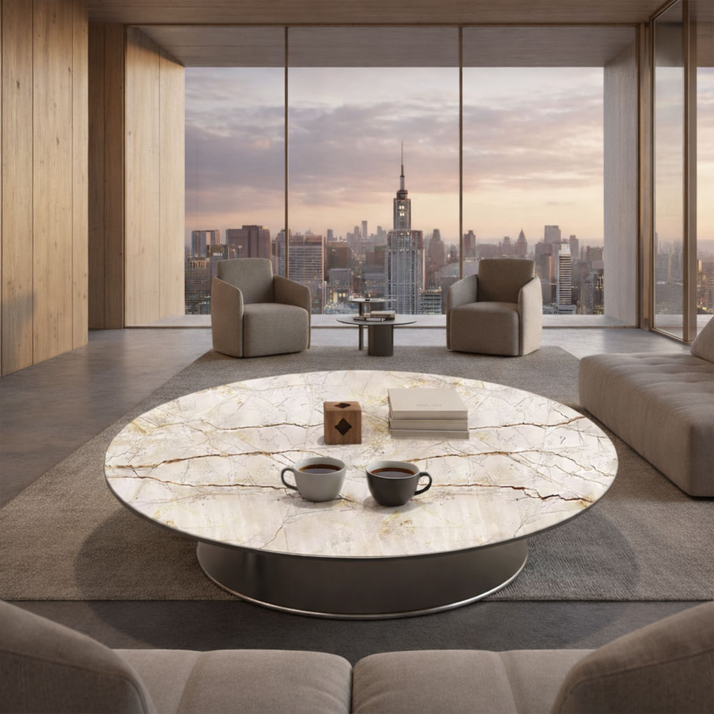 Di setiap ruang yang terasa “hidup”, selalu ada satu elemen yang tidak berteriak namun berbicara paling lantang. Kara Marble Coffee Table – 1.0 hadir sebagai elemen itu. Sebuah coffee table berbentuk bulat dengan top marmer alami dan kaki metal solid, dirancang untuk menjadi pusat gravitasi visual—tanpa mengganggu harmoni ruang. Ia tidak sekadar mengisi ruang, tetapi memberi makna pada setiap momen yang terjadi di sekitarnya.
