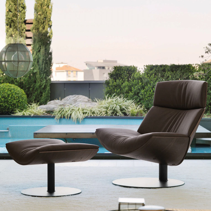 The clean, formal design of the Kara offers limitless comfort, with a luxurious 120° swivel base. Soft, leather cushions enclosed in a protective, wooden shell for a warm and natural appeal.