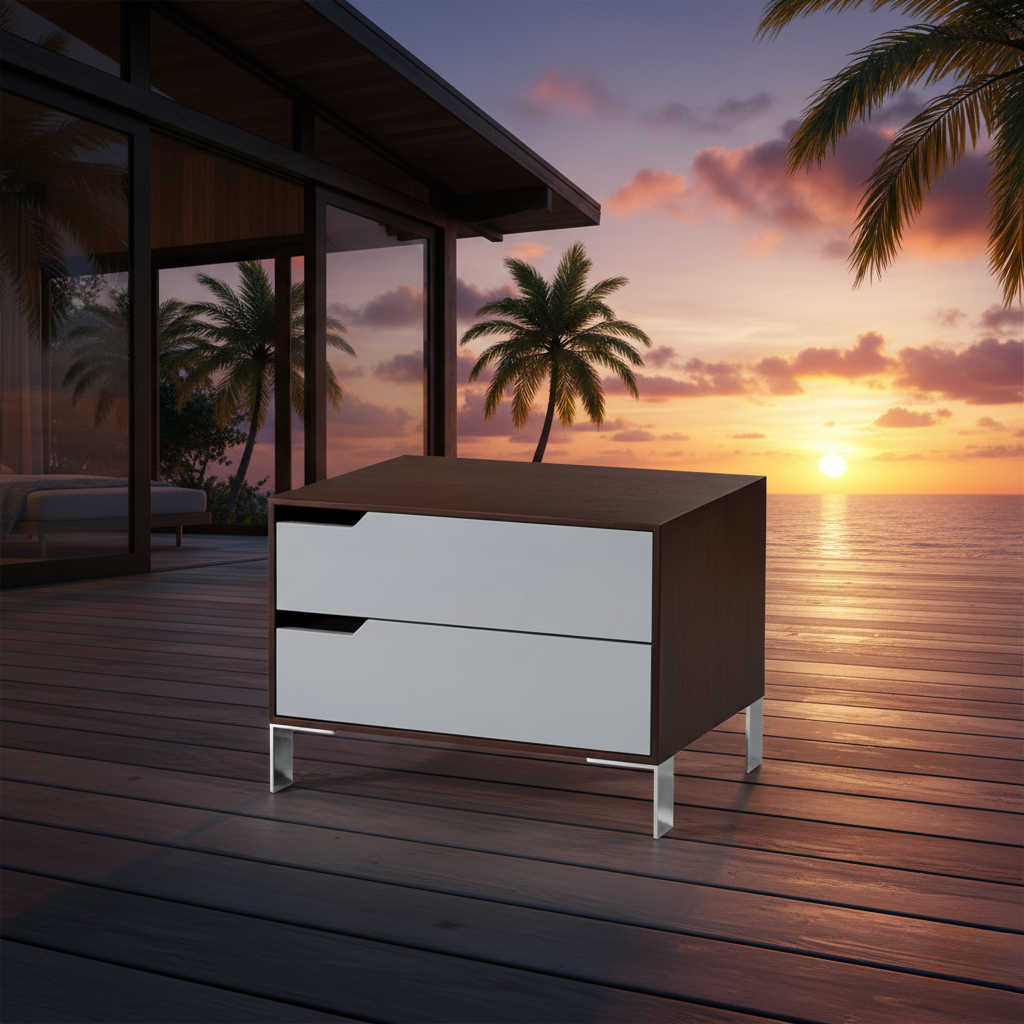Kestrel Bed Side Table menggabungkan kehangatan veneer dark walnut, kekuatan rangka metal, dan kemewahan aksen stainless steel dalam desain minimalis yang elegan. Meja samping ini tahan lama dan sempurna melengkapi kamar tidur modern dengan sentuhan hangat dan fungsional.
