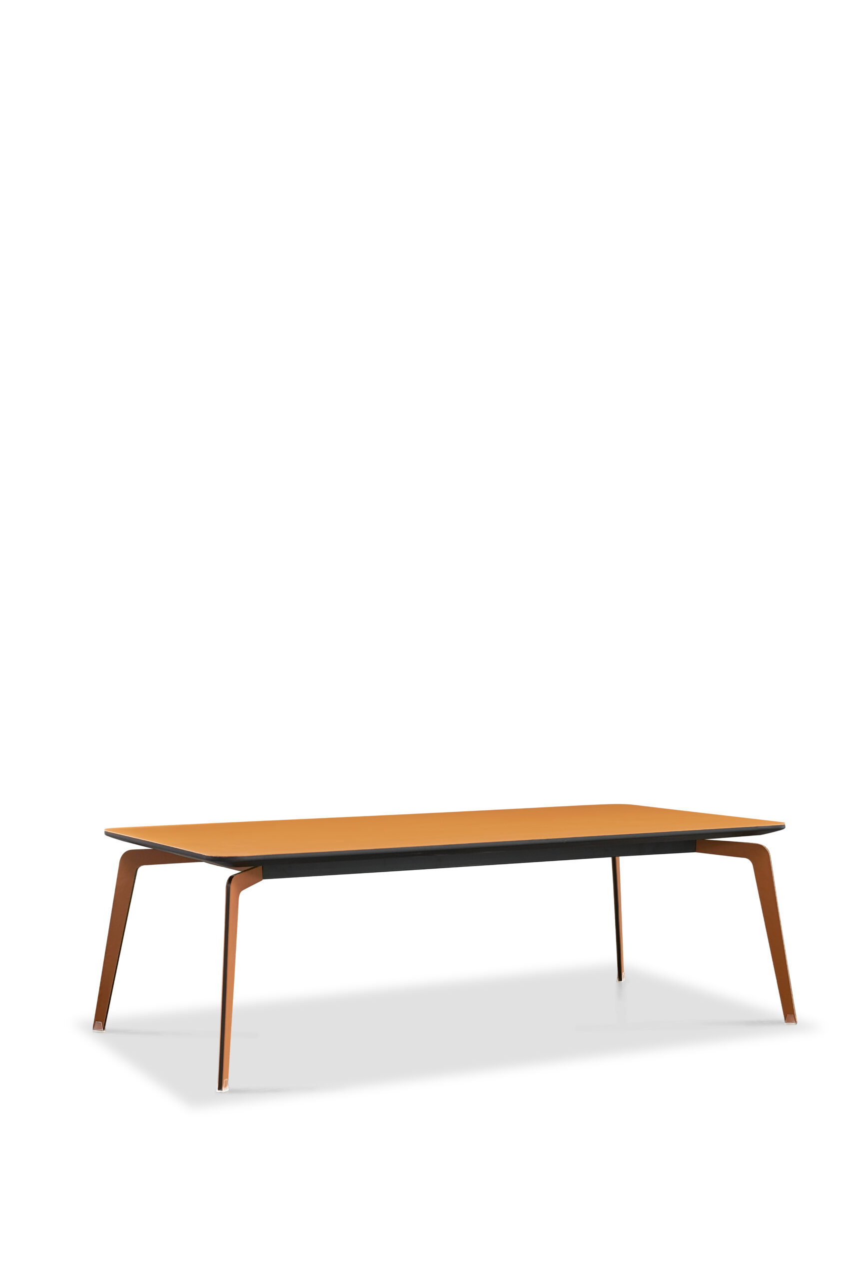 Supported by angled legs that echo the LINEA design language, the table maintains a strong architectural identity while remaining approachable. It is well suited for boardrooms, creative meeting spaces, and multifunctional offices where design quality matters as much as functionality.