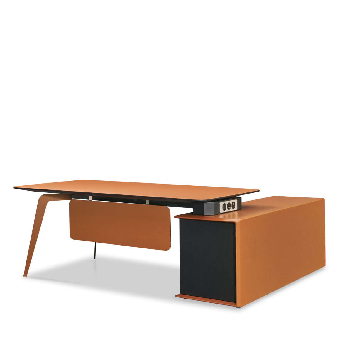 Designed for everyday productivity, the desk incorporates open compartments and closed drawers to accommodate documents, tools, and personal items without cluttering the workspace. The contrast between the refined surface and the structured storage unit adds architectural depth, making the desk feel composed rather than purely functional.
