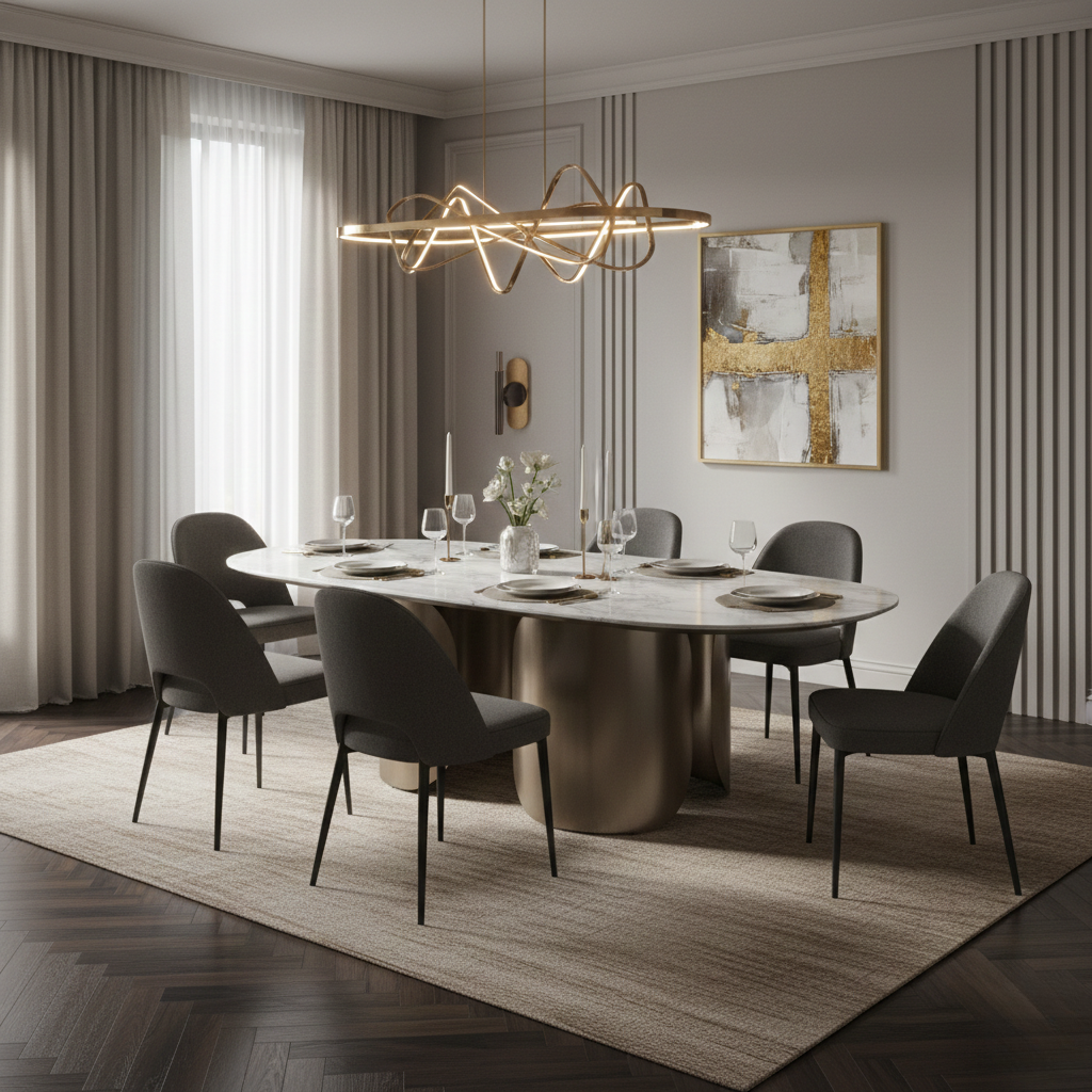 Di pusat setiap rumah yang aspiratif, terdapat sebuah titik temu di mana cerita dibagikan dan kenangan abadi diciptakan melalui perjamuan yang hangat. Lise Dining Table 3.0 hadir bukan sekadar sebagai furnitur fungsional, melainkan sebagai sebuah mahakarya visual yang menggabungkan kekuatan elemen bumi dengan presisi arsitektur modern. Dengan siluet oval yang mengalir mulus dan dimensi yang megah, meja ini menjadi simbol prestise yang mengubah setiap ruang makan menjadi galeri seni pribadi, mengundang setiap tamu untuk merasakan kemewahan yang intim namun tetap tampak sangat berwibawa di setiap sudutnya.
