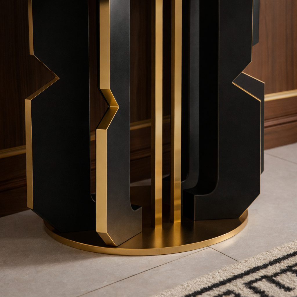 Logan Console Table memadukan marmer Lorence hitam mewah dengan kaki besi berlapis warna kopi dan emas, sempurna untuk menambah sentuhan elegan dan fungsional di ruang masuk atau ruang tamu Anda.