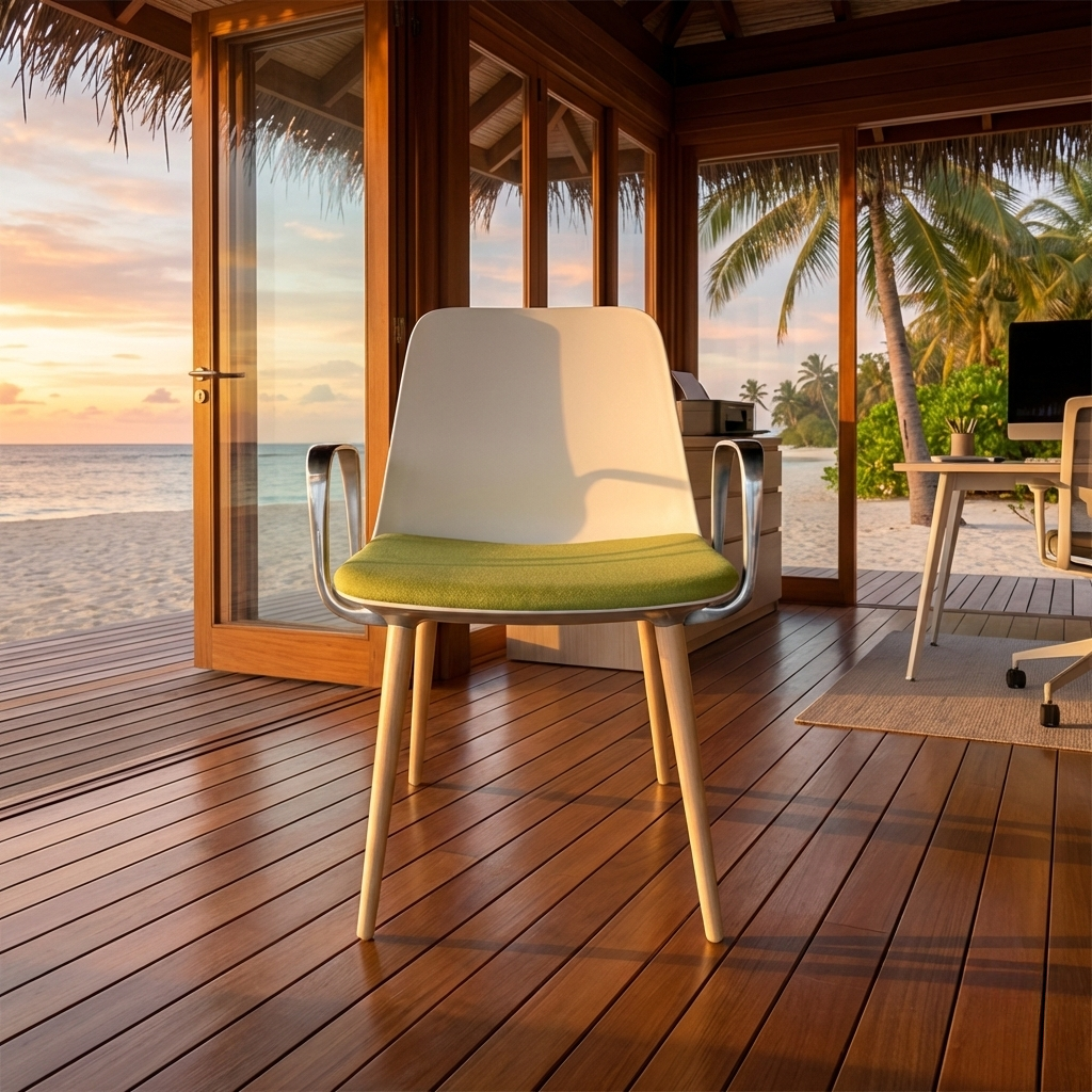 Lola 03A bukan sekadar kursi kerja. Ia adalah elemen yang menghidupkan ruang. Warna hijau pada bantalan duduk membawa nuansa segar dan menenangkan, sementara kaki kayu menciptakan koneksi visual dengan alam. Kursi ini membantu mengurangi kesan steril di ruang kerja, menjadikannya tempat yang lebih ramah, kreatif, dan manusiawi.