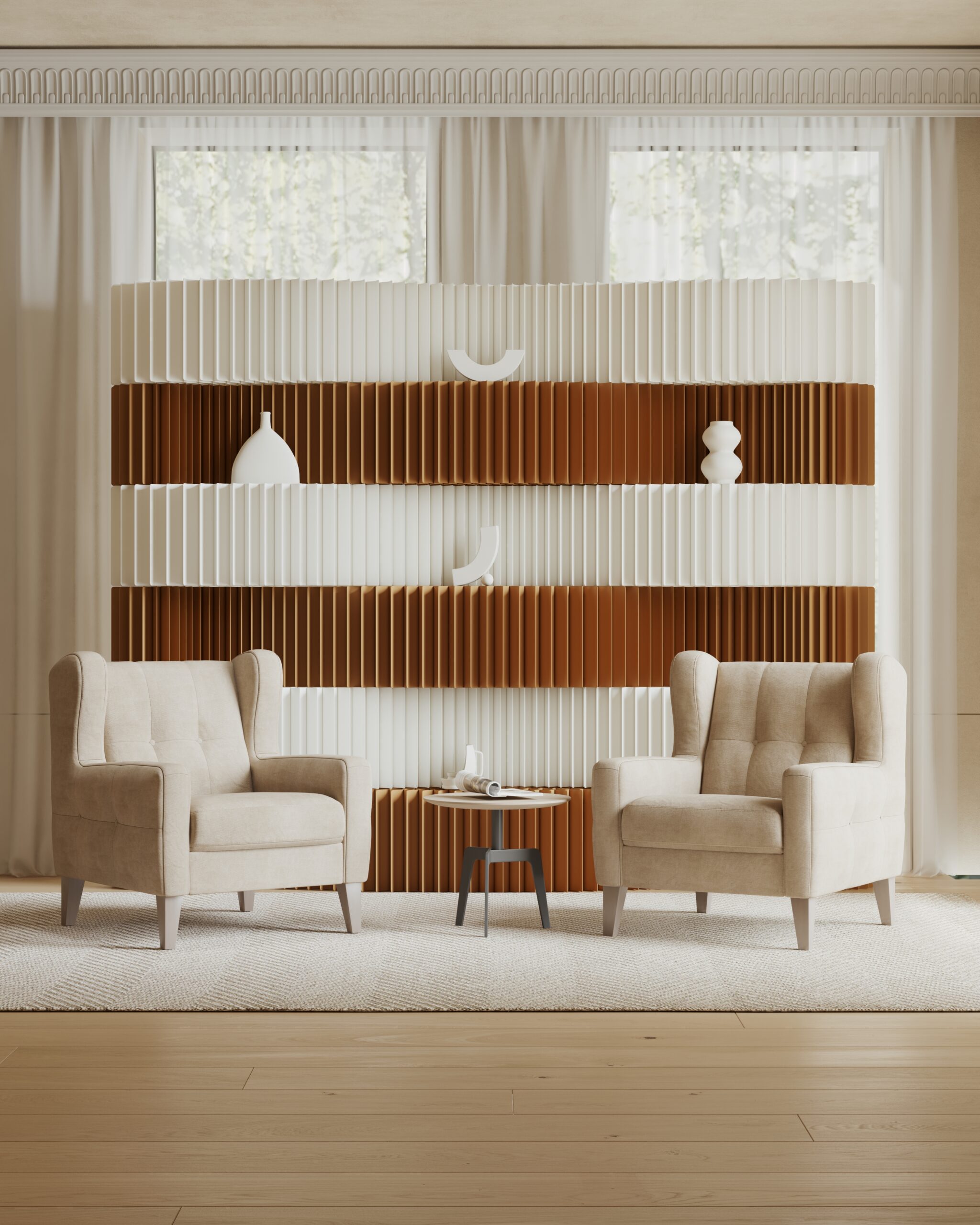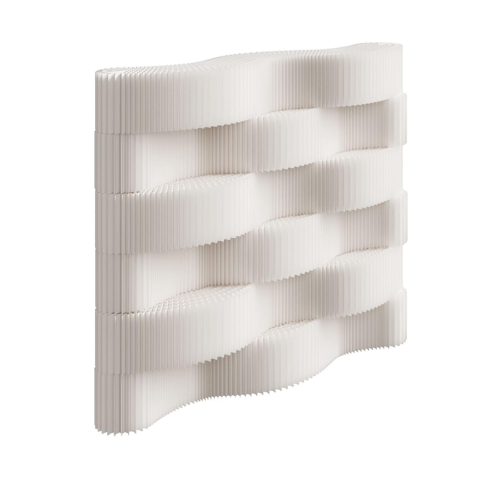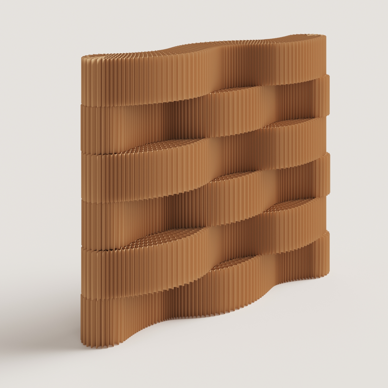 The composition alternates solid ribbed volumes with recessed display planes, creating a continuous play of light, shadow, and depth. The softly undulating profile introduces movement without visual noise—calm, architectural, and unmistakably contemporary.