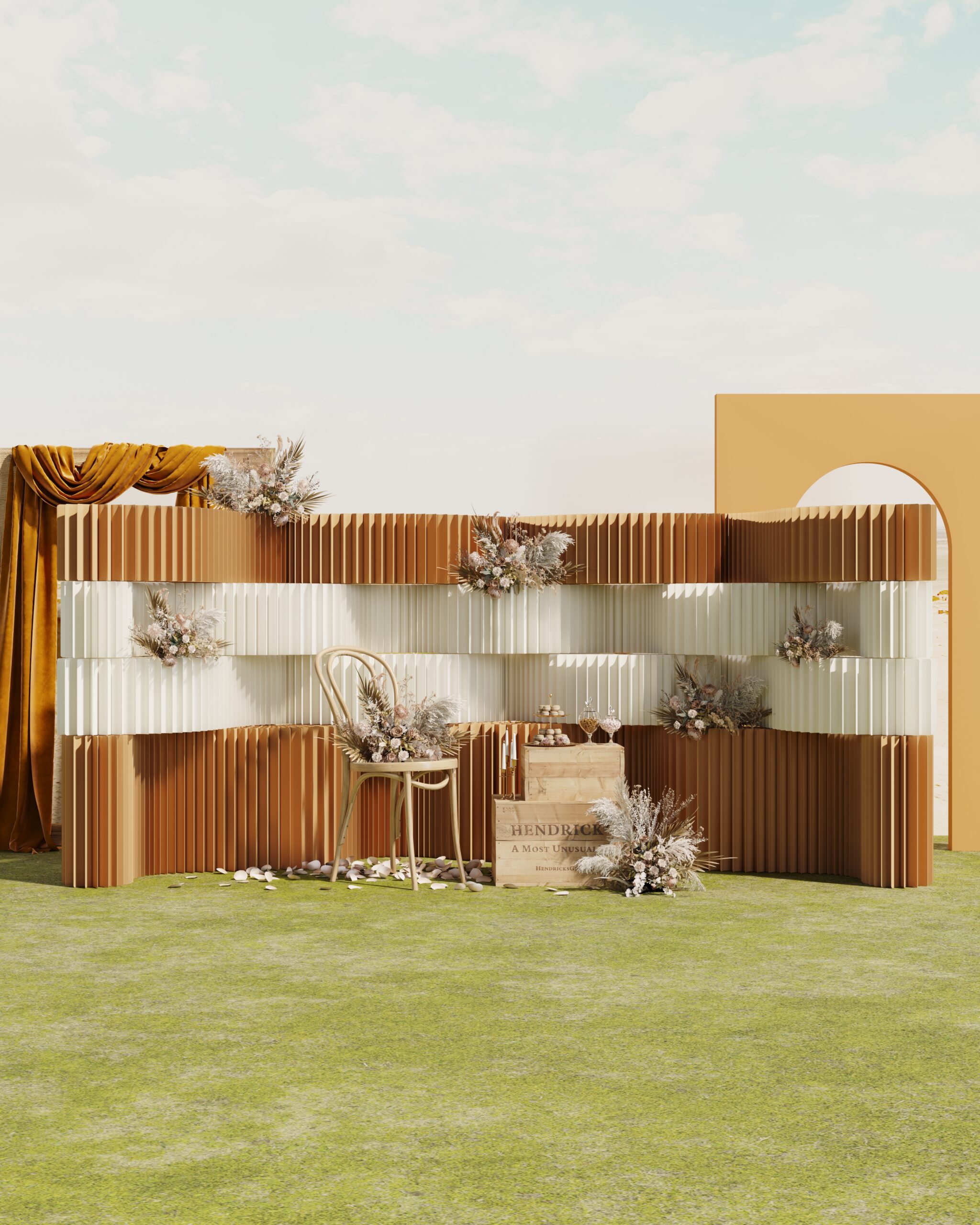Magia Ritmo is a sculptural wall system defined by rhythmic vertical fluting and layered horizontal bands, designed to function simultaneously as a display surface, spatial divider, and architectural backdrop.