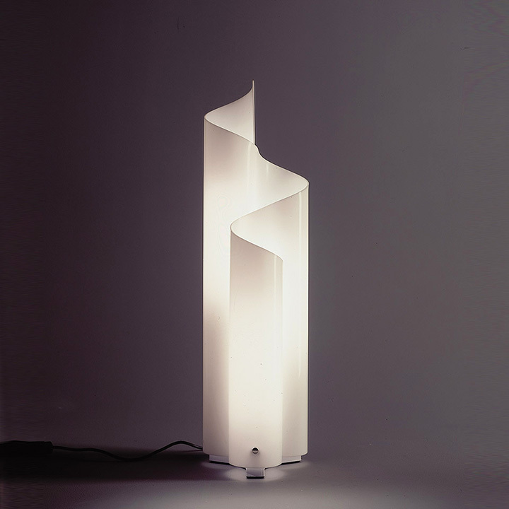 Its sinuous curves resulting from the shaping of a sheet of frosted methacrylate softly diffuse the light. It brings together “simplicity and concept” which for Magistretti are at the heart of durable design