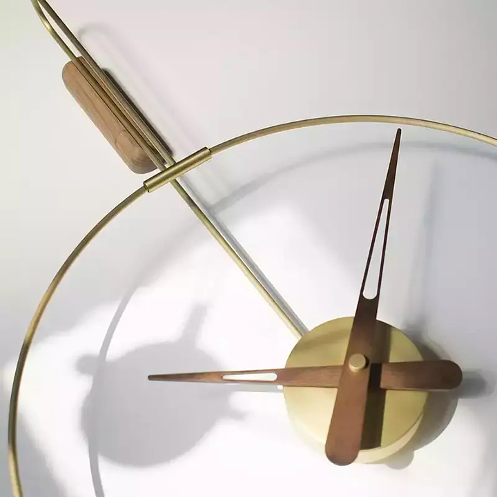 Micro Daro G wall clock with case and outer circle in polished brass, hook and hands in natural walnut wood. Its clean and premium materials create a striking focal point in any room, while its versatile design complements a variety of decor styles, from minimalist to eclectic.