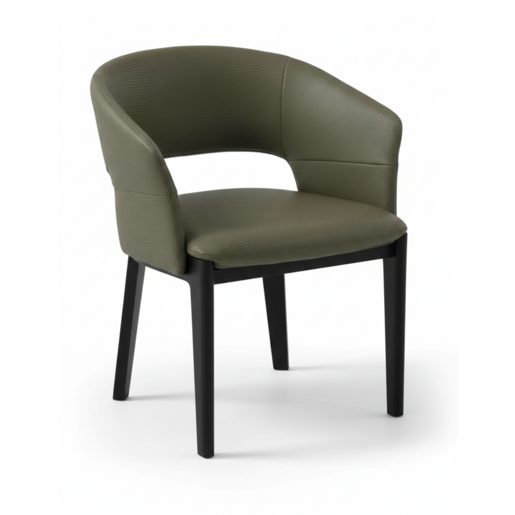 Modena pairs a slim upholstered seat-and-back with a sculptural solid wood frame. The angled arm structure creates a distinct modernist profile while providing comfortable support, making it ideal for both dining and meeting settings.