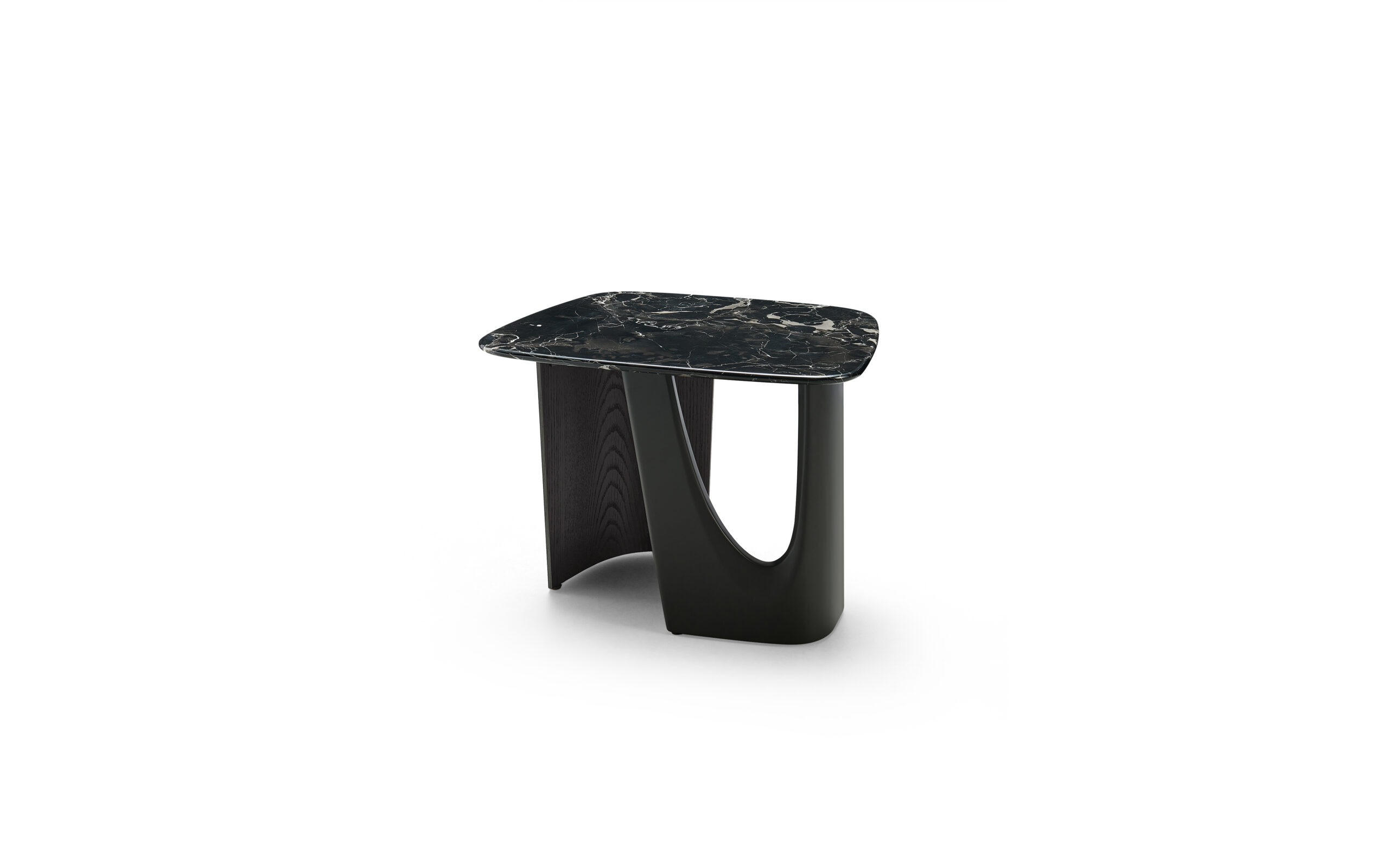 The contrast between materials—stone and wood, light and dark—enhances its architectural character. Rounded edges and continuous surfaces give the tables a fluid presence, while the offset heights allow layered compositions that adapt to different seating arrangements.