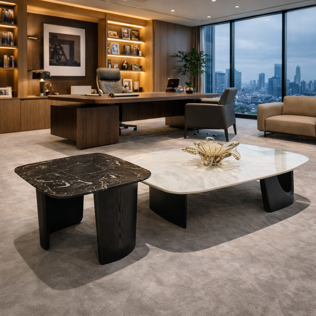 NEXA is a sculptural coffee table duo defined by fluid geometry and architectural contrast.