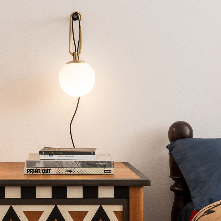 A white blown glass sphere slides along a brushed brass ring, which allows it to take different positions and to freely adjust and direct the diffuser. The frame becomes a support, a hook to hang the appliance to the wall, or a handle promoting an interaction with light, allowing freedom in creating countless lightscapes