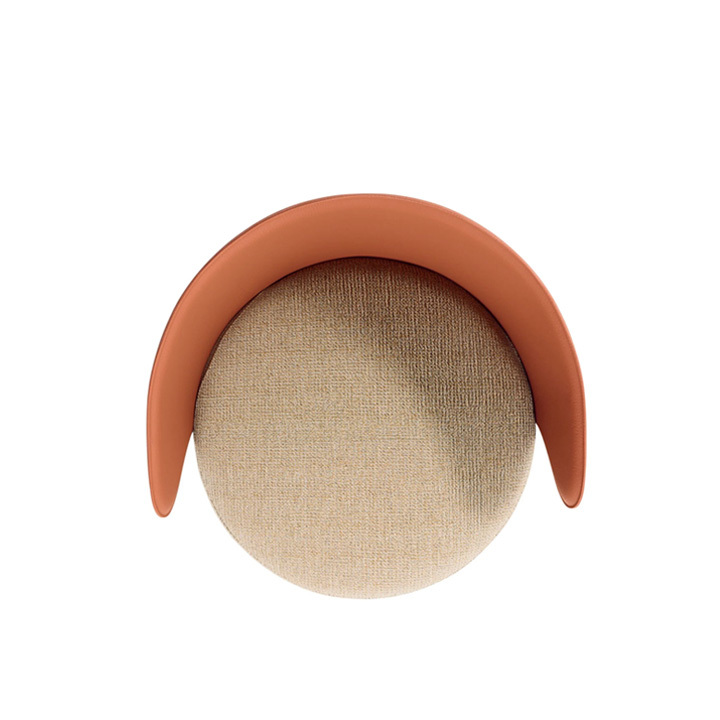 - Sandaran melingkar dengan desain menyeluruh yang membungkus tubuh secara alami, dilapisi kulit sadel berwarna merah bata (Terracotta) dengan tekstur halus dan karakter hangat