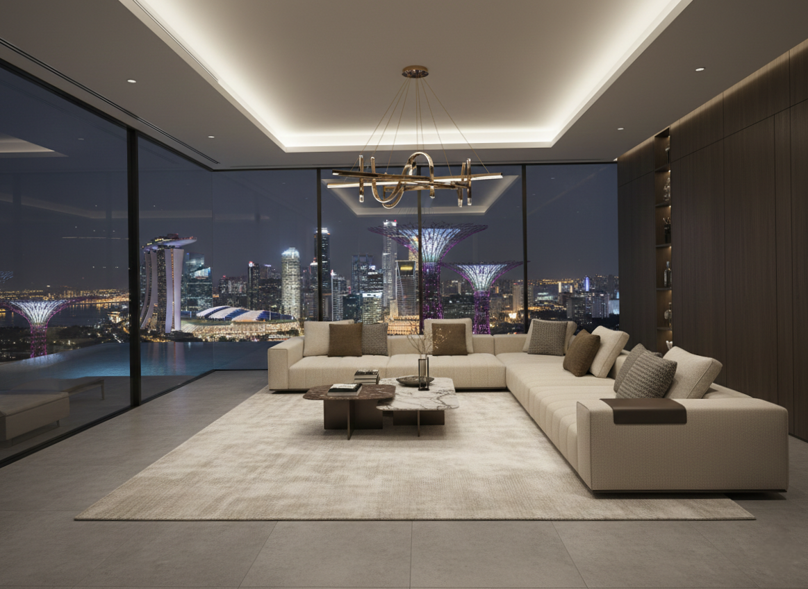 A long, low modular sofa designed for open-plan living clean, grounded, and deeply comfortable.