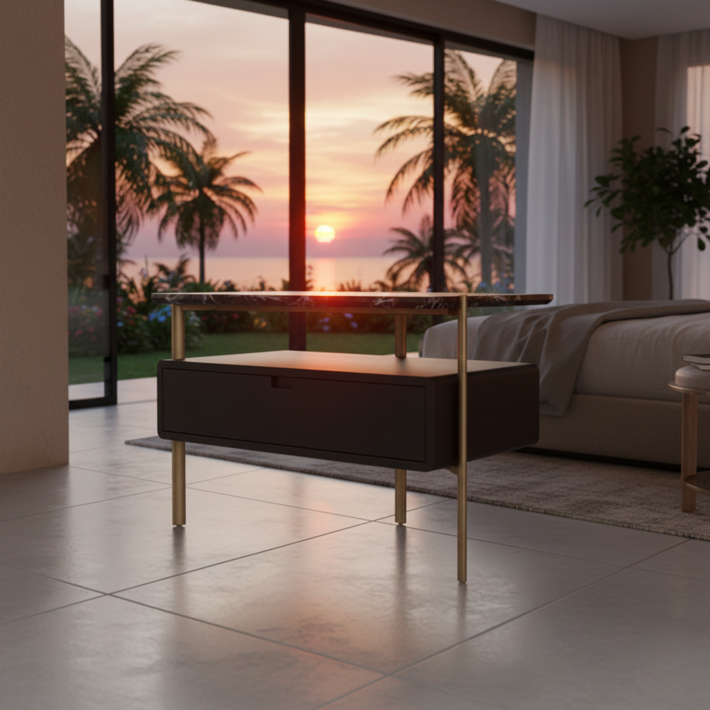 Porvo Bedside Table adalah meja samping tempat tidur yang memadukan kemewahan marmer alami, kehangatan kayu solid, dan kekuatan hardware berkualitas tinggi. Desain elegan dan material premium menjadikannya pilihan sempurna untuk menambah keindahan dan fungsi di kamar tidur Anda.