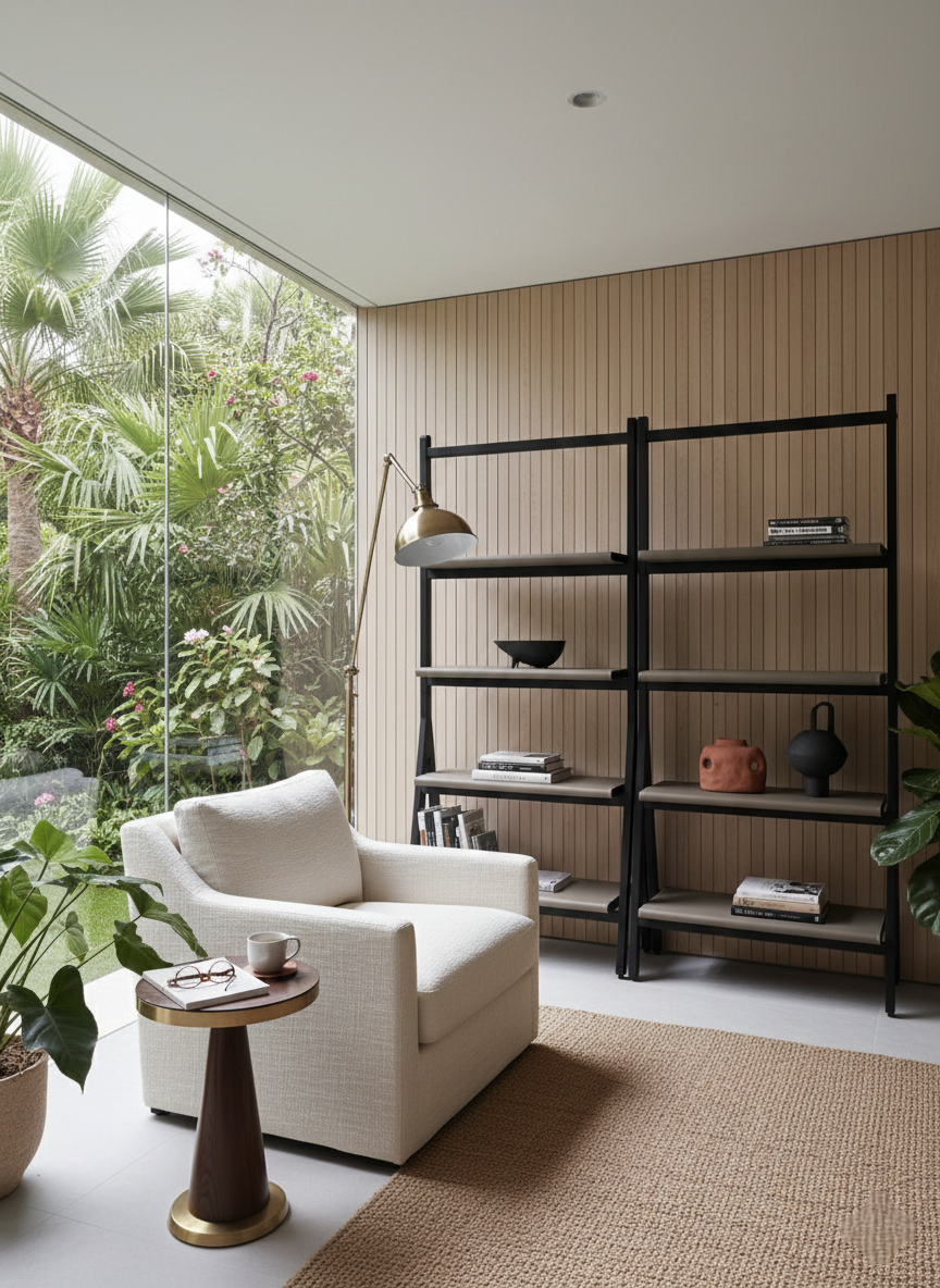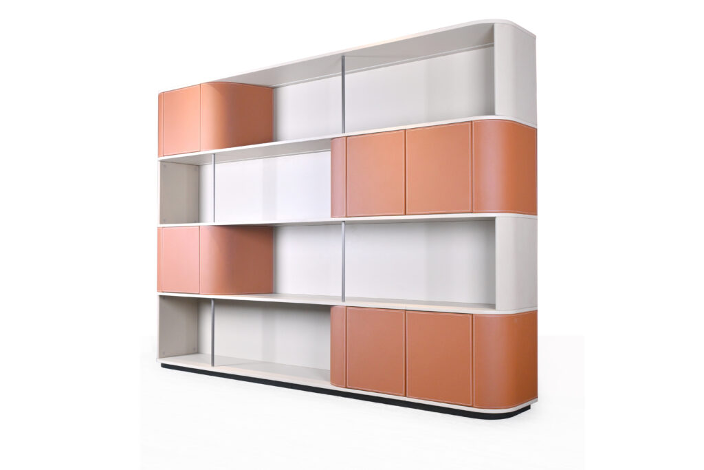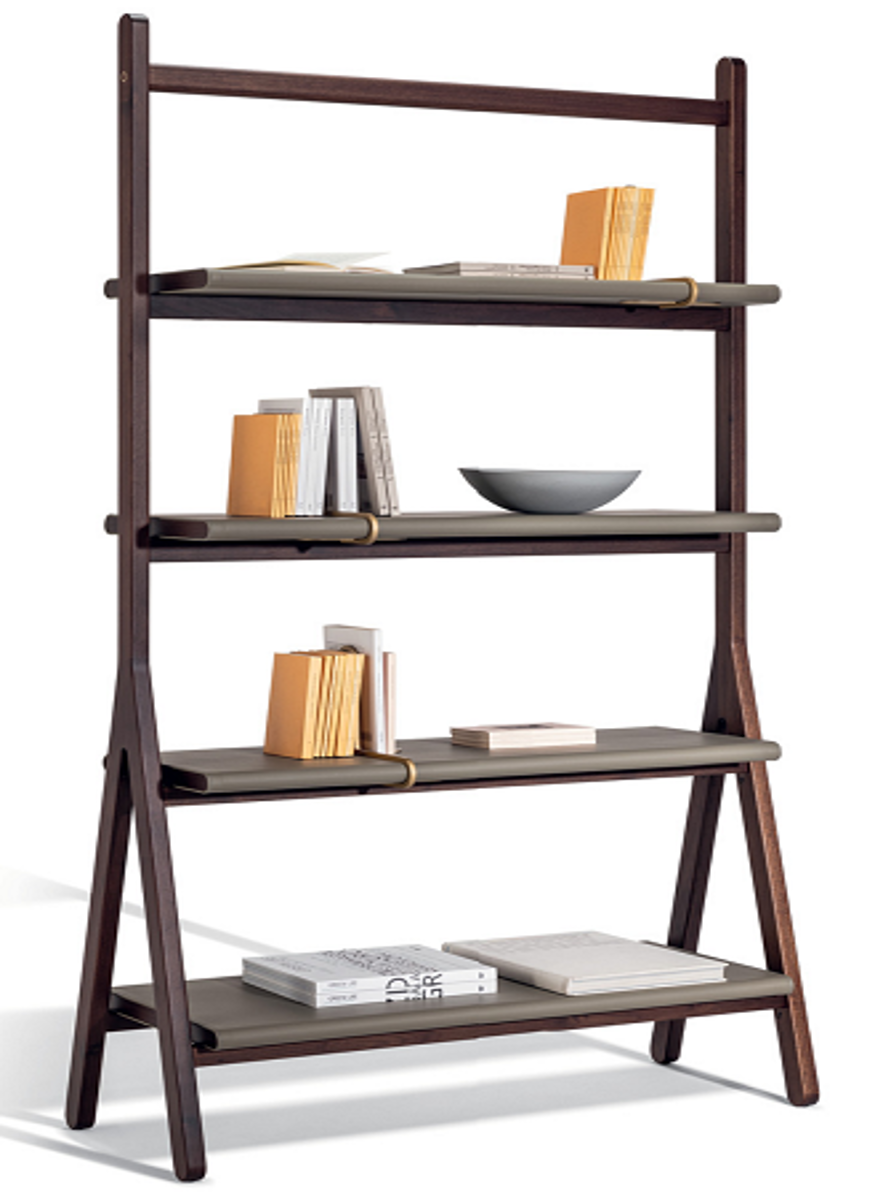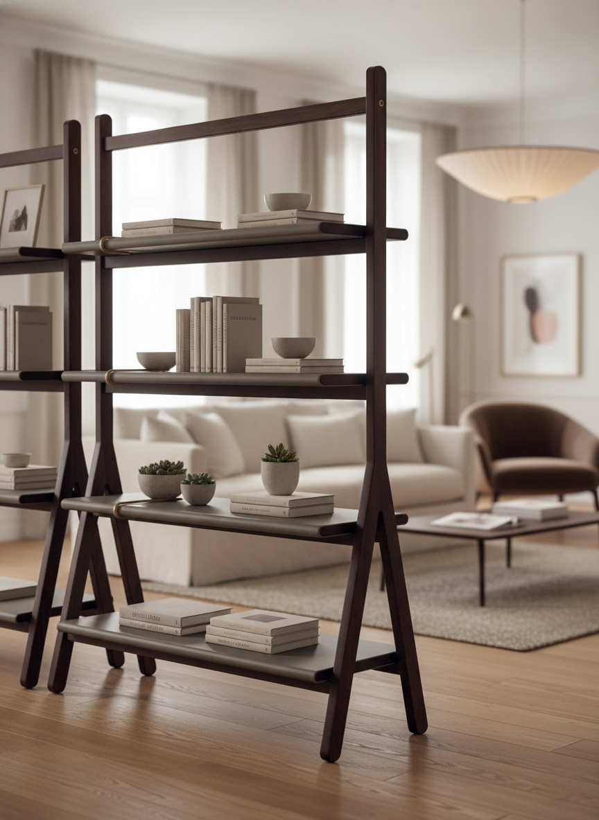 A refined open shelf designed to display books and objects with a clean, architectural presence.