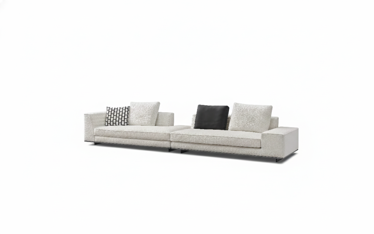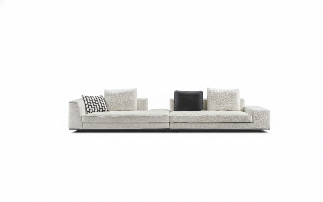 Its composition is defined by bold, linear volumes and generous proportions, creating a sense of stability and permanence. The seating plane is wide and grounded, while the backrests and arm elements are deliberately restrained, allowing the form to feel powerful without visual excess.