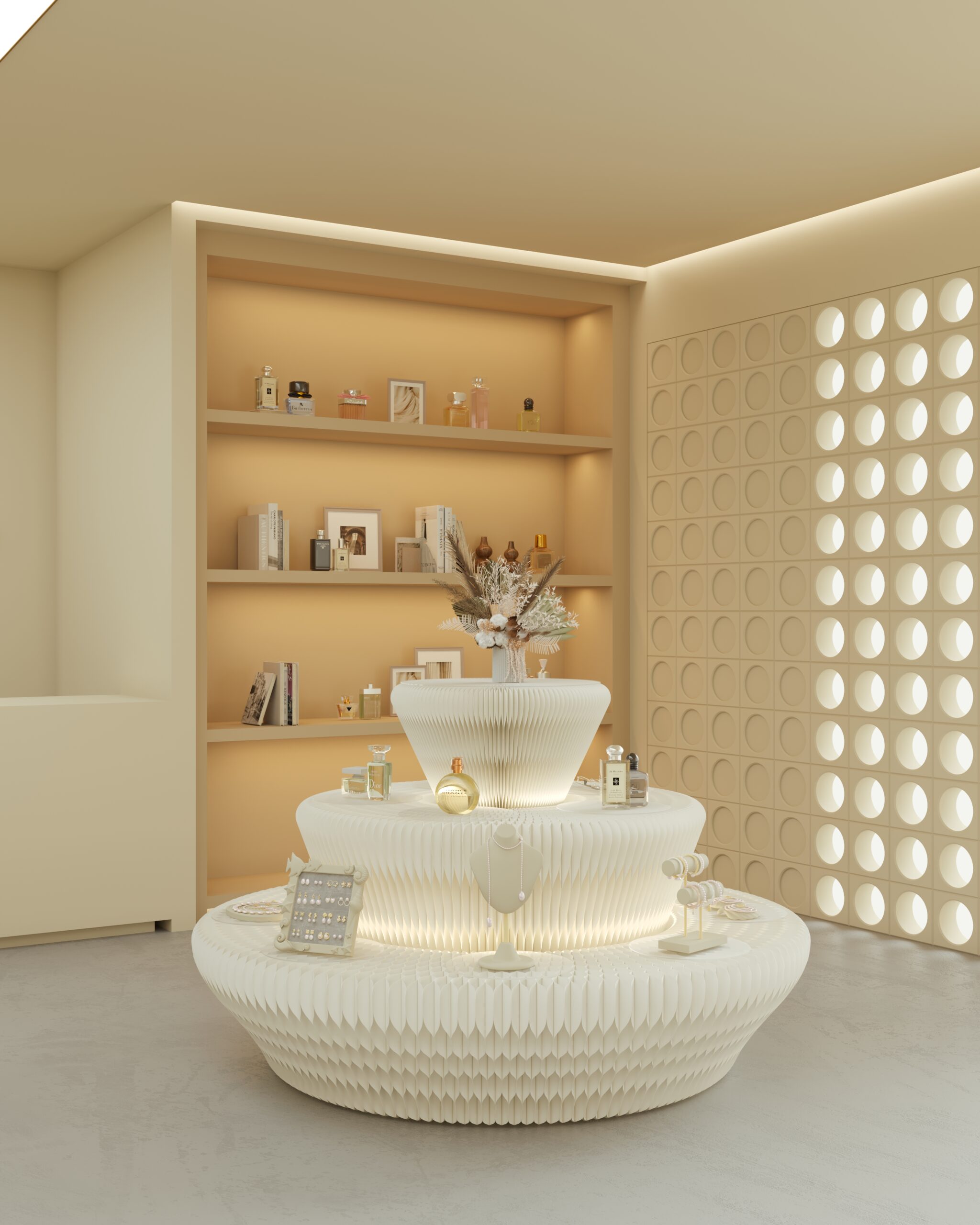 Integrated warm LED lighting is subtly concealed within each tier, casting a soft glow through the folded structure. The light enhances textures, highlights silhouettes, and adds depth without overpowering the products.
