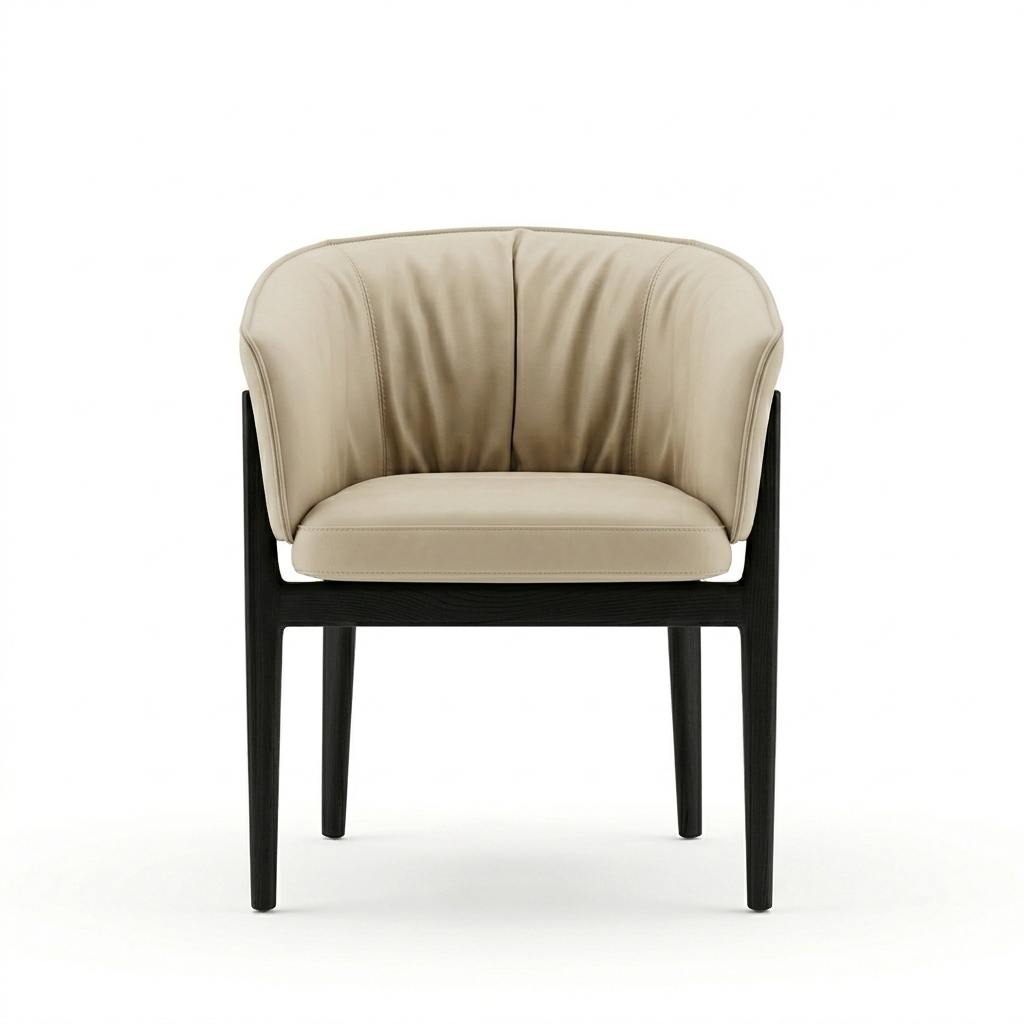 Valora features a gently curved backrest that wraps around the seat, creating a comfortable and supportive seating experience. The tailored leather upholstery enhances the softness of the form, while the solid wood frame introduces structure and contrast.