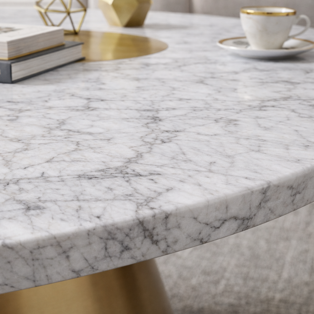 - Top meja menggunakan marble Carrara putih matte setebal 16mm dengan finishing asli yang menampilkan tekstur halus dan warna natural