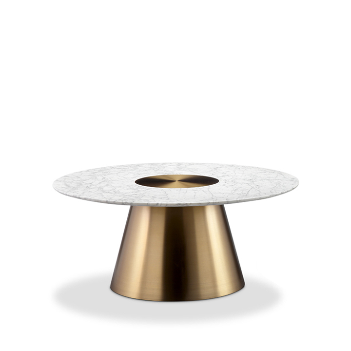 Washington Coffee Table hadir dengan marble Carrara putih matte dan kaki stainless steel brushed Japanese gold untuk kemewahan dan ketahanan tahan lama.